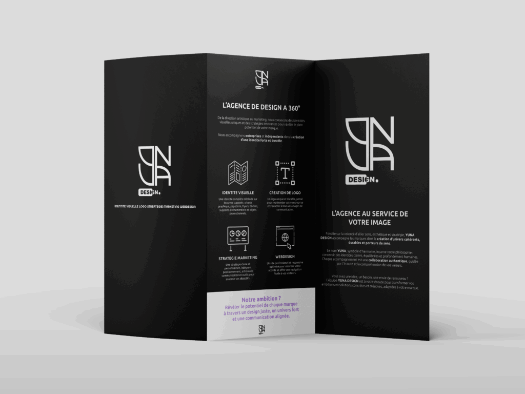Chez YUNA DESIGN, nous pensons qu’une identité réussie doit être à la fois stratégique et émotionnelle. Nous analysons votre activité, vos objectifs et votre public pour concevoir un univers visuel clair, cohérent et aligné avec votre vision.